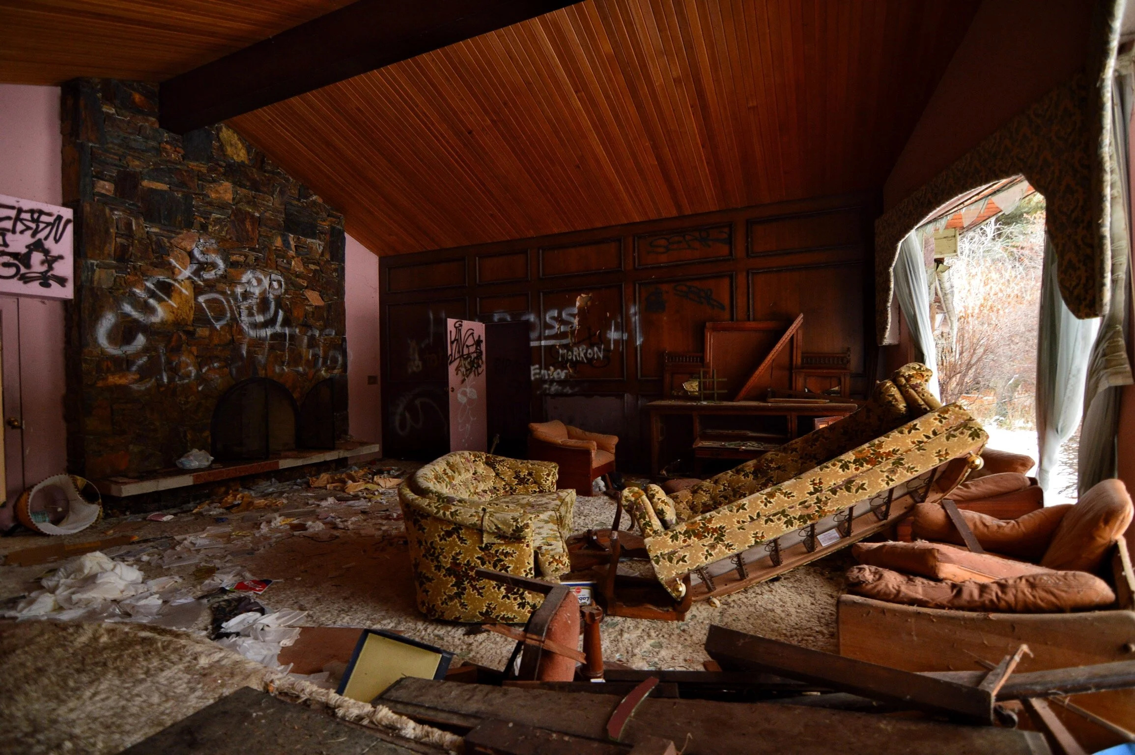 The home’s decor was grand and seemed to be from the late sixties into the seventies. Would have been an absolute masterpiece of a time capsule in its prime. Sadly vandals had their way with the property - the level of destruction had escalated since the last post i found online. Ive heard dozens of stories about the property: Long forgotten bank foreclosure, an old Japanese tree farmer’s plot of land, to a romping 70’s party mansion full of life and vigor. They seem to all lend a hand around the mystique of the site , as it would possibly get a second life down the road.