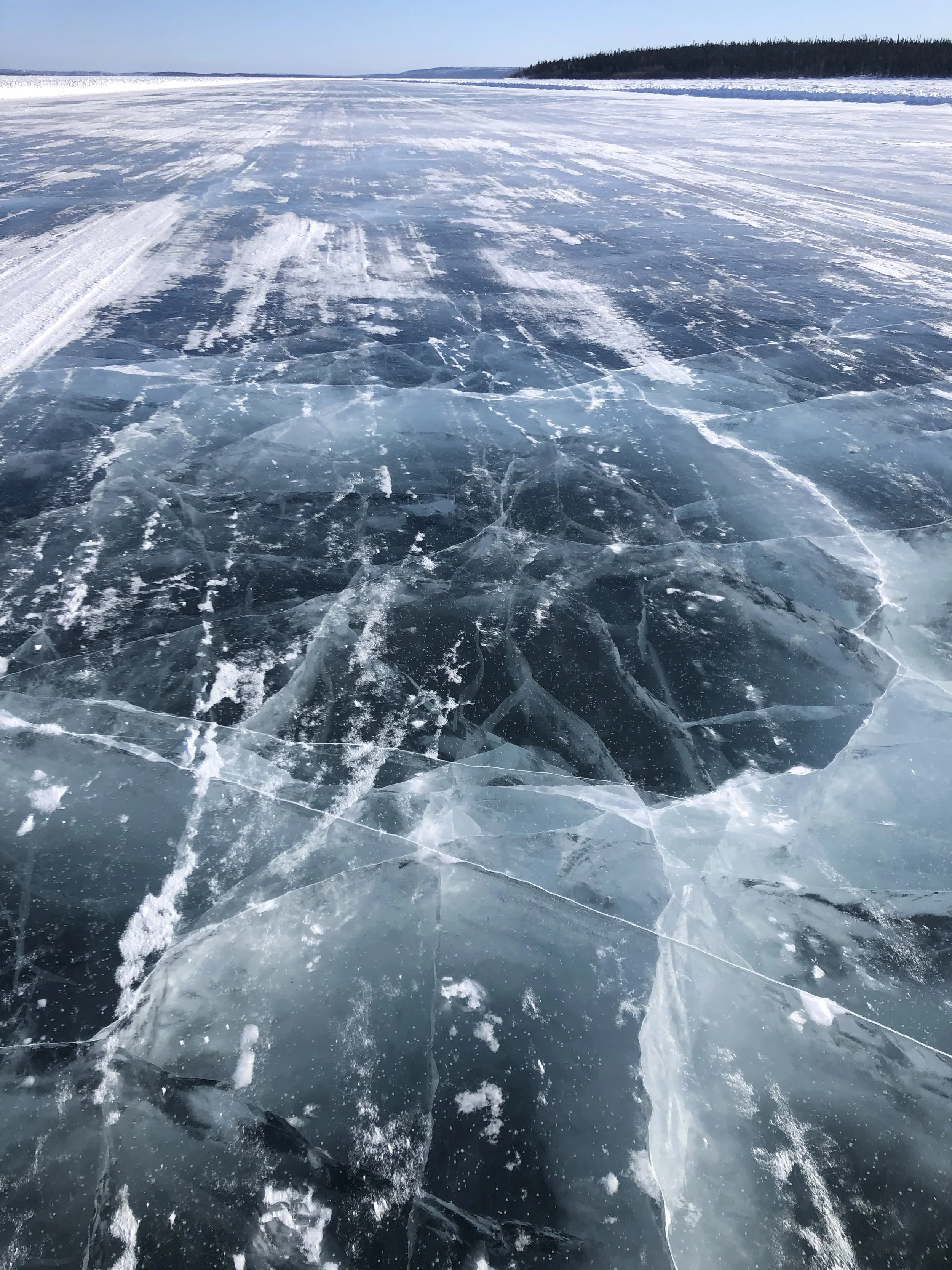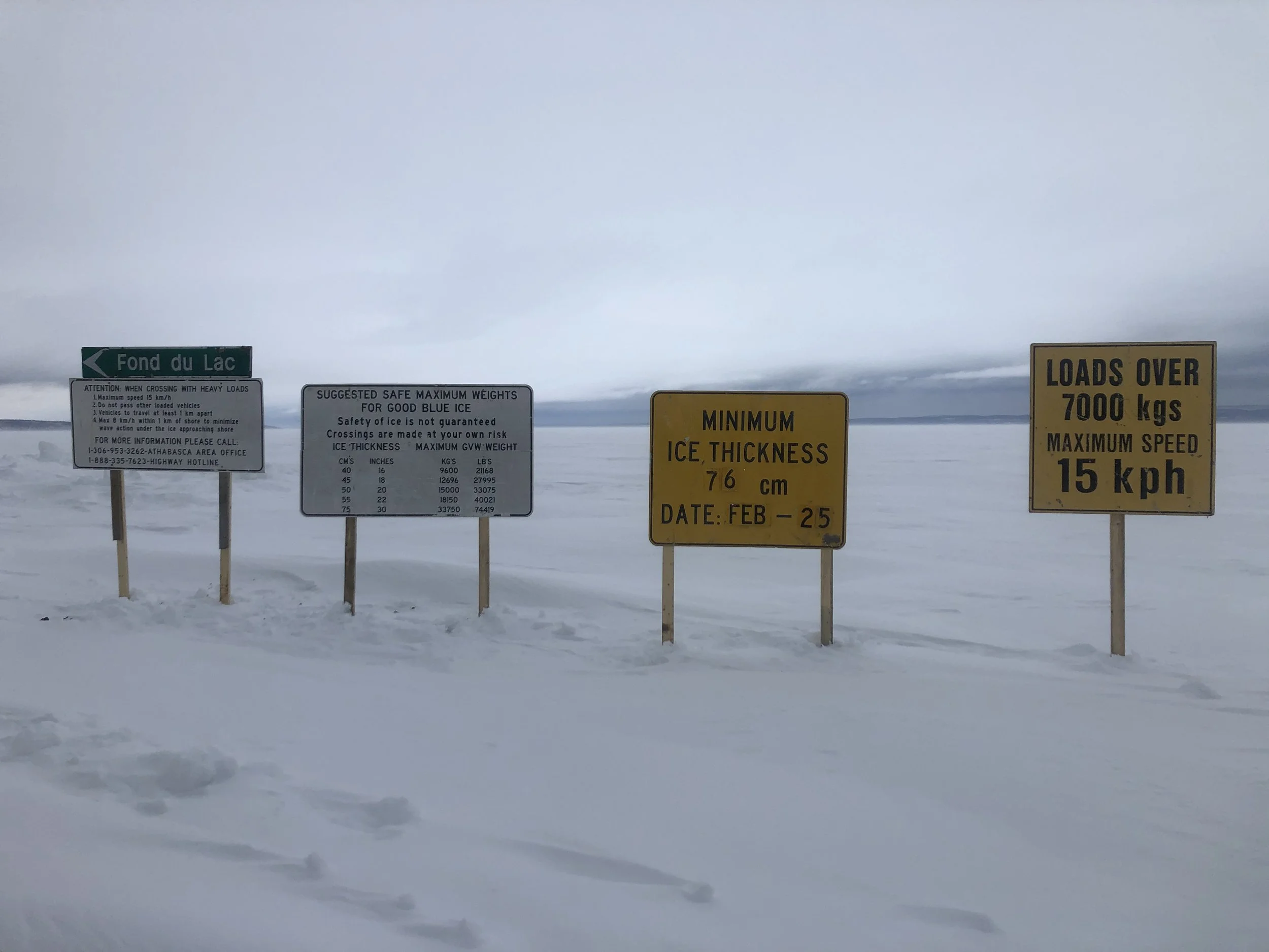 From Stony Rapids to Fond du Lac, the road transformed into something extraordinary — a vast, plowed ice highway across Lake Athabasca. Here, the landscape opened into an otherworldly expanse: no cell signal, no landmarks, just frozen horizon in every direction. At times, the shoreline was 20 kilometres away, and we drove on 45 centimetres of ice, thick enough for pickups but off-limits to heavier freight.